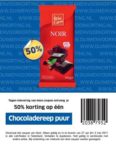 Lidl Kortingsbon voor 50% korting op een reep Chocolade puur